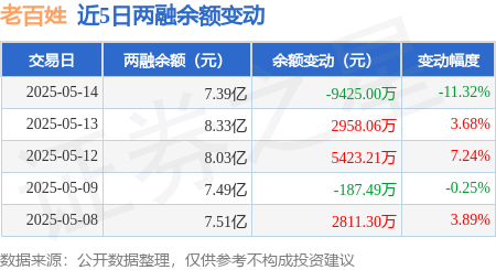 本站消息,5月14日,老百姓(603883)融资买入1.22亿元,融资偿还2.16亿元,融资净卖出9410.45万元,融资余额7.35亿元,近20个交易日中有12个交易日出现融资净买入。